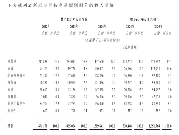 林清轩的业绩增长高度依赖山茶花修护精华油这一单品。2014年,林清轩推出核心大单品山茶花精华油。截至2025年6月30日,该产品累计销售超4000万瓶,2024年该产品贡献营收4.48亿元,占比达37%,且连续11年位居中国面部精华油品类零售额第一。从产品矩阵看,林清轩虽已扩展至面霜、爽肤水、面膜等品类,但尚未形成第二增长曲线。2022年至2024年,乳液及爽肤水、精华液对总收入的贡献占比持续下降。