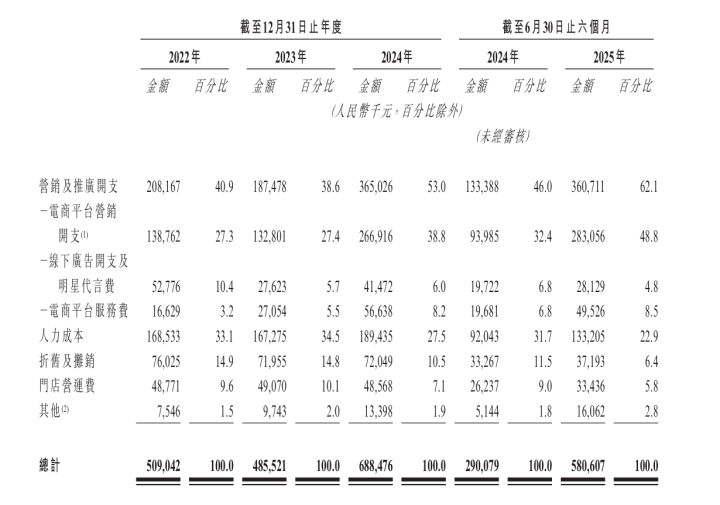 然而,高毛利的背后,是“重营销、轻研发”的商业模式。招股书显示,2022年至2024年,林清轩的销售及分销开支分别为5.09亿元、4.86亿元、6.88亿元。其中,2024年的销售及分销开支中,营销及推广开支高达3.65亿元,约为同期研发支出的12倍。2025年上半年,销售费用同比再增至5.81亿元。